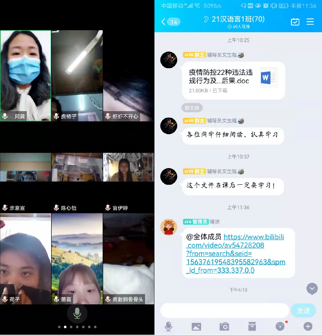 在学生工作处的倡导下,各位辅导员迅速研判学生身心状况,通过开展疫情防控期间“健康与法制”主题教育云班会、走访学生宿舍开展学生思想政治教育工作,加大学生对传染病防治等法律法规的宣传教育力度,引导我校学生在疫情期间增强健康与法制意识,配合疫情防控工作。