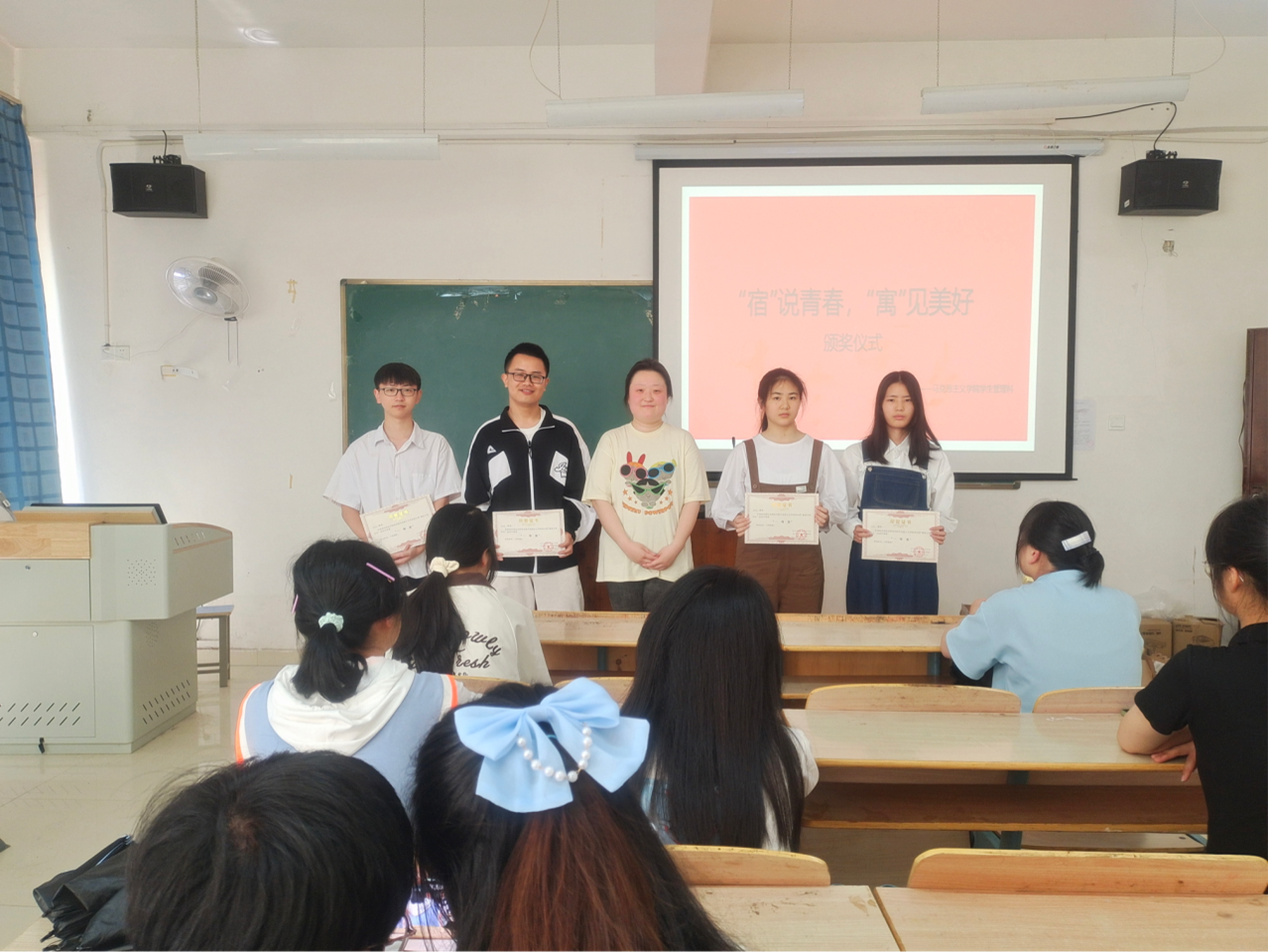 5月5日在教学楼2102教室举行了“宿”说青春,“寓”见美好文明寝室评比活动的颁奖仪式,康柠老师应邀出席颁奖仪式为获奖寝室颁发荣誉证书。康柠老师强调,学生寝室不仅是学生在校学习、生活、休息的重要场所,同时也是大学生养成良好生活习惯和培养综合素质的阵地,希望同学们能养成并继续保持良好生活习惯,加强寝室文明建设,为自己和室友营造出安全、整洁、舒适、和谐的良好寝室氛围。