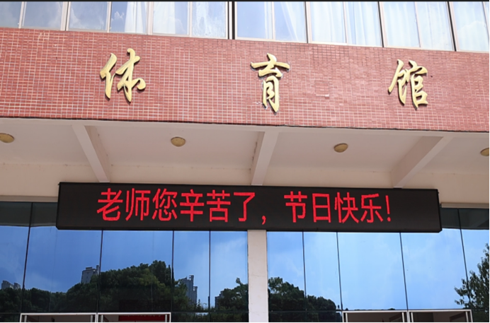 教师节期间,教学楼前电子显示屏滚动播放着“老师您辛苦了!节日快乐!”等字样,为老师送上“一句节日问候”,以此弘扬尊师文化,引导社会各界感念师恩、礼敬教师,营造浓厚的节日氛围。