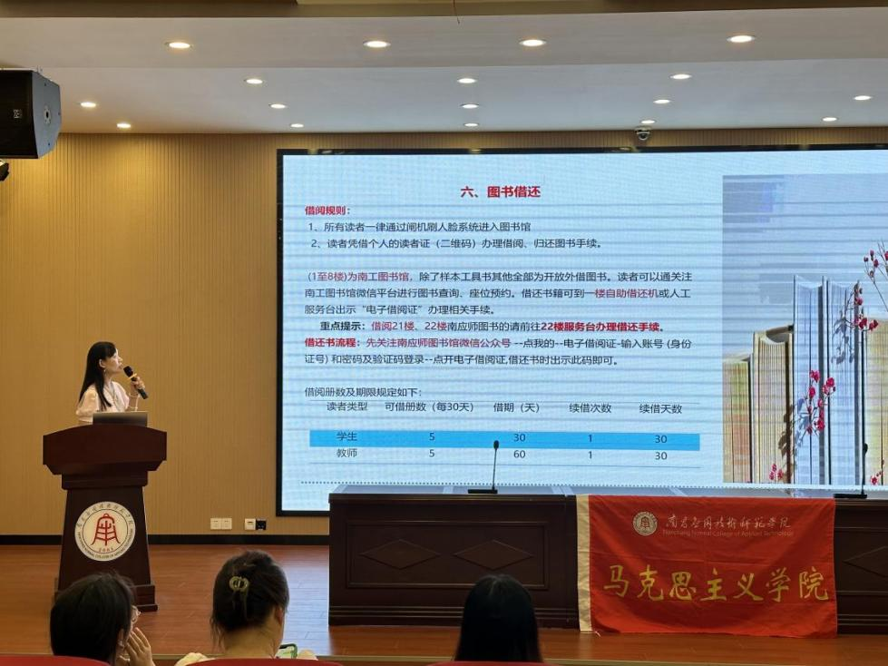 会议第一项议程是校图书馆负责人张春艳发言。她为新生讲解图书馆管理制度并且她表示为鼓励学生积极参与阅读,爱上读书,宣传、倡导和引领读书之风,为打造书香校园,培养阅读习惯,图书馆全体职工将会带领又有朝气蓬勃精神面貌认真履行义务,绝不辜负同学们的信任和期望,大家共同将图书馆的各项工作做好落实好。