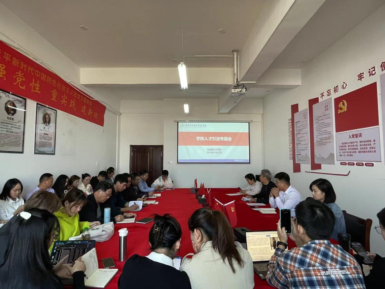 为贯彻落实学校人事人才工作会议要求,进一步推进学院人才引进工作开展,11月7日下午,学院在1511会议室召开人才引进专题会议。院长文道贵、党总支书记张欣康、党总支副书记李婷、副院长张丹及全体教职工参加会议,会议由院长文道贵主持。