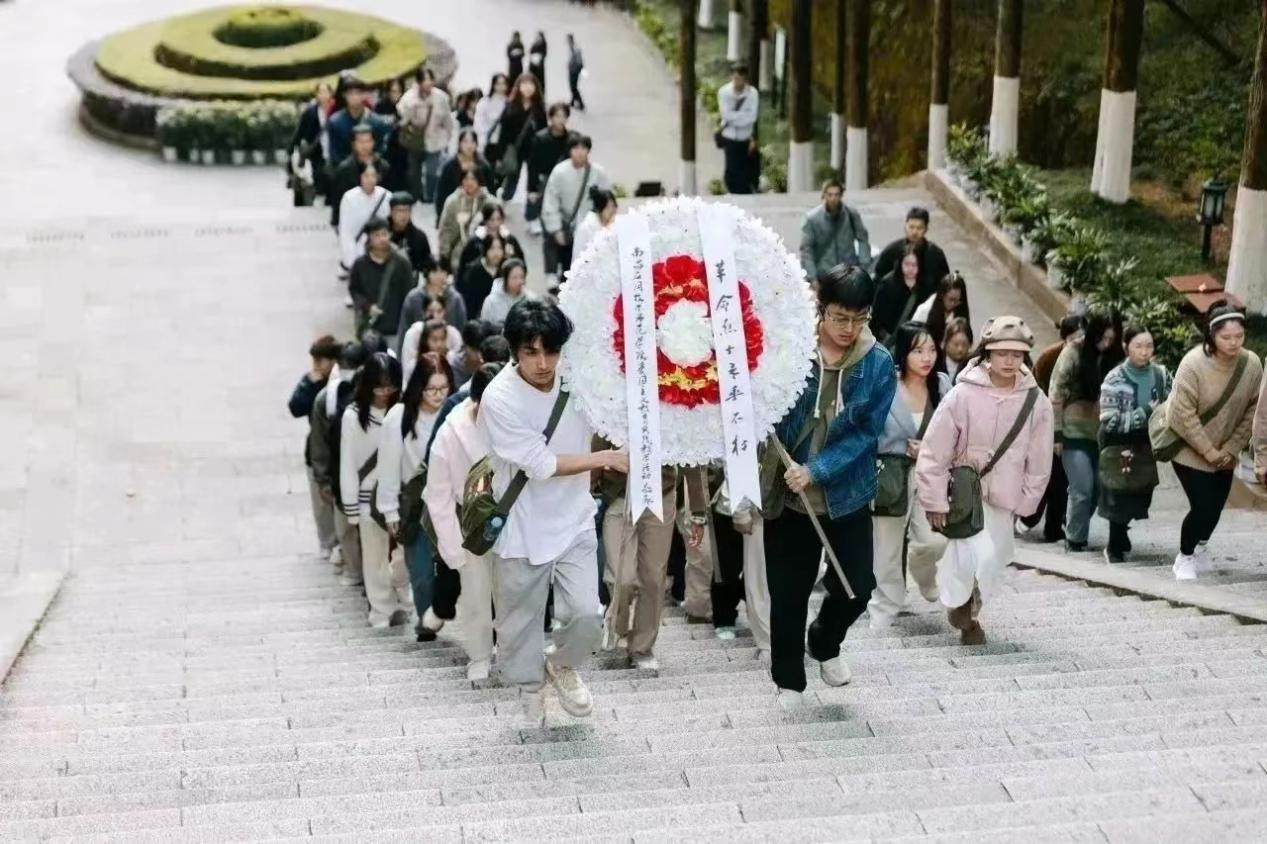11月23日,师生们来到井冈山革命烈士陵园,向革命烈士敬献花篮。师生们在此重温入党、入团誓词,追忆革命先烈的英雄事迹,向他们表示崇高的敬意。