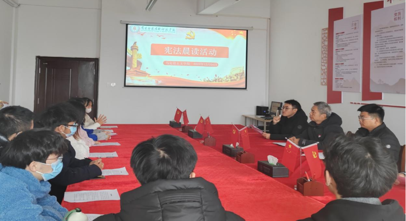 为进一步提高全体师生法律意识,引导学生深入了解宪法、尊崇宪法精神,增强法治观念,推动校园法治文化建设,beat365在线体育官网登录入口于2023年12月4日上午9:30在1511会议室组织开展了“宪法晨读”活动,活动由法学教研室主任李水根主持,院长文道贵、党总支书记张欣康、党总支副书记李婷、副院长张丹、法学教研室部分专任老师以及法学班20名学生参加。