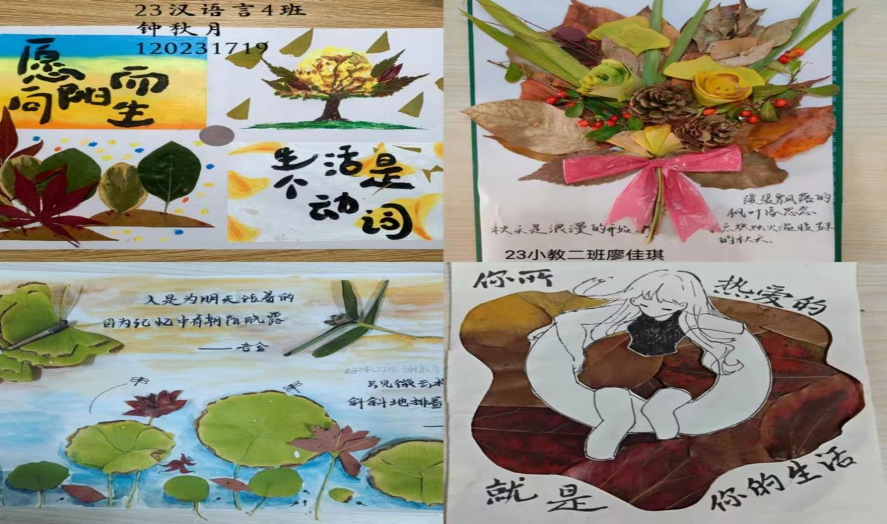 活动过程中同学们发挥自己的天马行空的想象力,以秋叶为元素,创作精美手工作品,通过不同的材料和独特的作品构图,表达作者心中的畅想和动人的故事。同学们就地取材,银杏叶、白果、树枝都成为艺术作品的材料,以枯枝落叶作画,在赋予它们新生命的同时疗愈自己的内心。同学们不仅在轻松愉快的氛围中缓解了焦虑,还从中汲取到了今后坦然面对学习生活压力的力量。