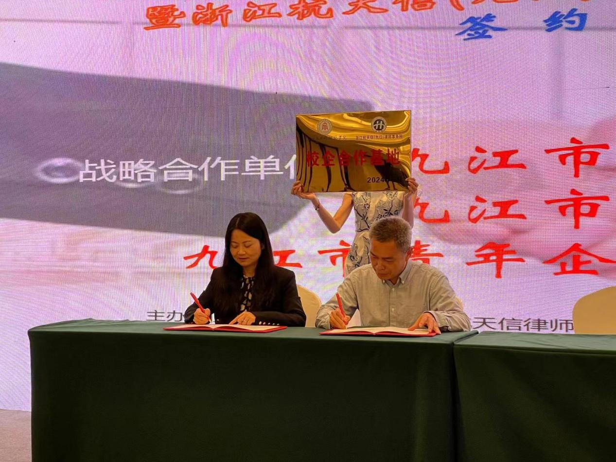 期间,文道贵院长一行还应邀出席了浙江省九江商会“双招双引”推进会暨浙江杭天信(九江)律师事务所启动仪式。在会上,文道贵院长与浙江杭天信律师事务所副主任汪红妖分别代表beat365在线体育官网登录入口与杭天信(九江)律所共同签署了战略合作协议,并举行了校企合作基地授牌仪式。