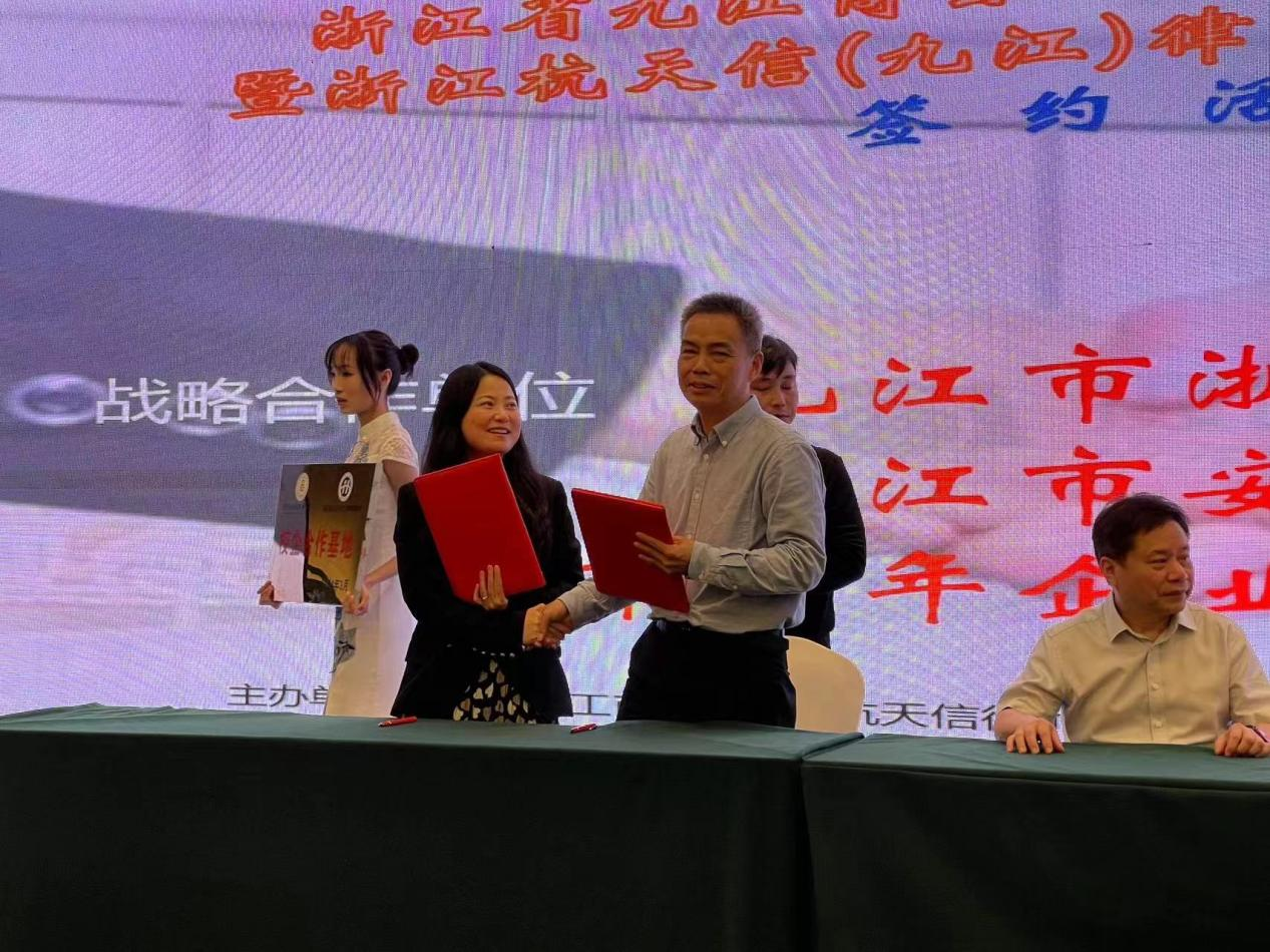 期间,文道贵院长一行还应邀出席了浙江省九江商会“双招双引”推进会暨浙江杭天信(九江)律师事务所启动仪式。在会上,文道贵院长与浙江杭天信律师事务所副主任汪红妖分别代表beat365在线体育官网登录入口与杭天信(九江)律所共同签署了战略合作协议,并举行了校企合作基地授牌仪式。