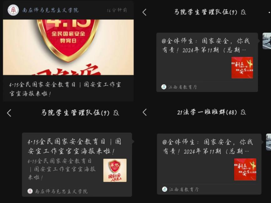 线上依托学院微信公众号平台,利用新媒体矩阵的优势,精心制作公众推文,以学生喜闻乐见的形式引导学生参与学习讨论、转发分享,积极宣传国家安全教育日相关信息,不断提高国家安全法治宣传的影响力和传播力。