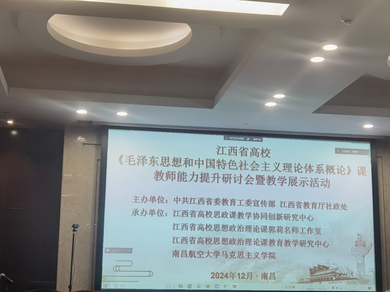 2024年12月1日,由中共江西省委教育工委宣传部、江西省教育厅社政处主办的《毛泽东思想和中国特色社会主义理论体系概论》课教师能力提升研讨会暨教学展示活动在南昌市前湖酒店举行。beat365思政教师刘东方参加了活动。