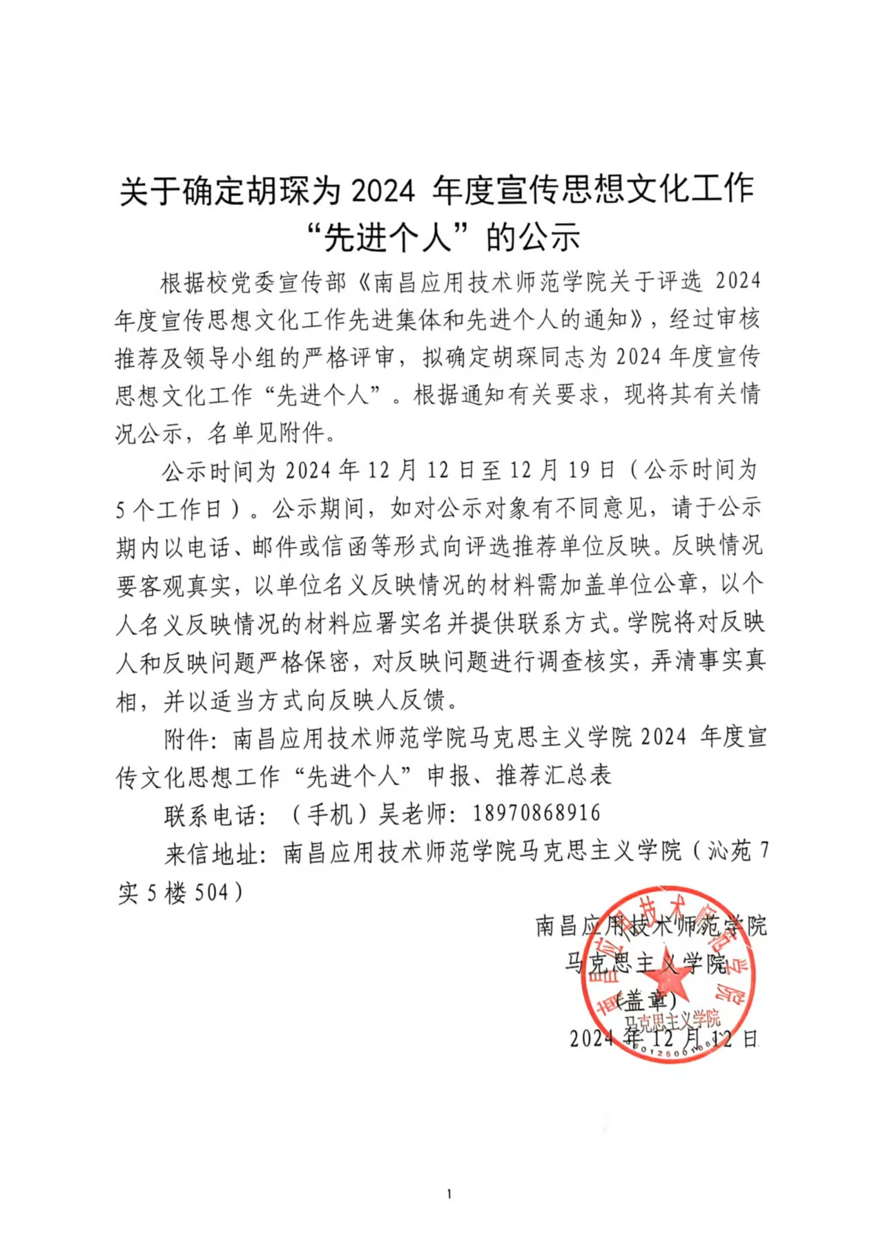 首页栏目 通知公告 学院新闻 习近平思想学习专栏 主题教育学习 院长书记信箱 您现在的位置是:首页 > 首页栏目 > 通知公告 关于确定胡琛为2024 年度宣传思想文化工作 “先进个人”的公示 学生科2024-12-124798 上一篇 关于拟将幸修丽、曹芮晨、徐雨婷、方伟思同志转为正式党员的公示 下一篇 2023-2024学年第一学期奖学金公示名单
