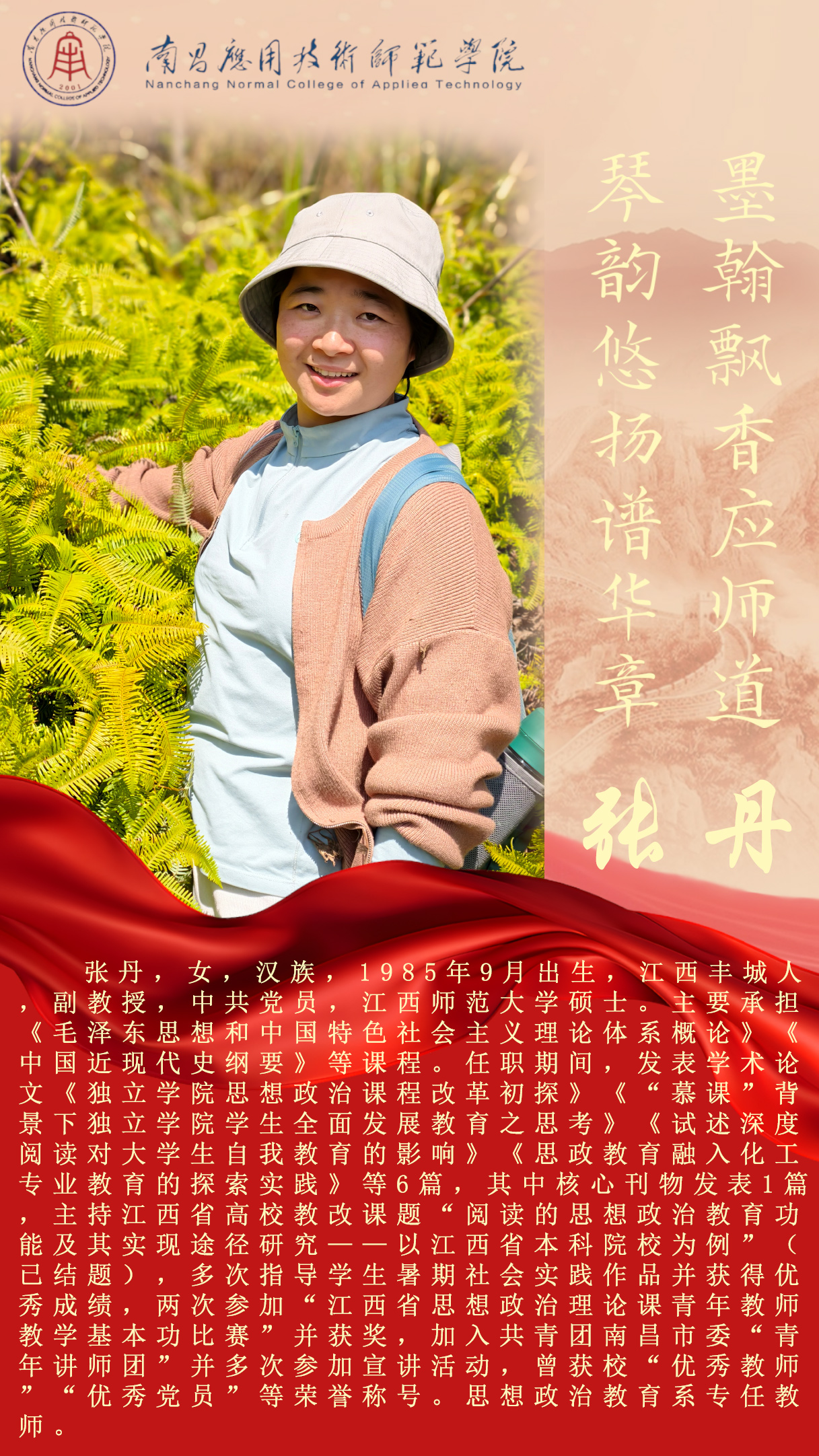先进典型 优秀毕业生 优秀在校生 优秀教职工 您现在的位置是:首页 > 先进典型 > 优秀教职工 张丹 副教授 综合办2025-04-022166 上一篇 桂光泽 教授 下一篇 敬业育人 默默奉献|优秀教师刘德彰