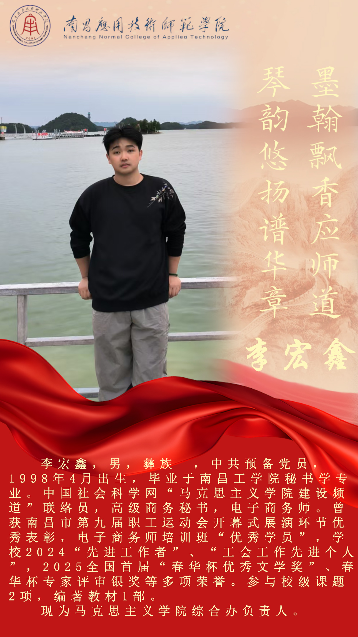 先进典型 优秀毕业生 优秀在校生 优秀教职工 您现在的位置是:首页 > 先进典型 > 优秀教职工 李宏鑫 先进工作者 管理员2025-04-172178 上一篇 邹颖 最美辅导员 下一篇 石仁凤 优秀教师