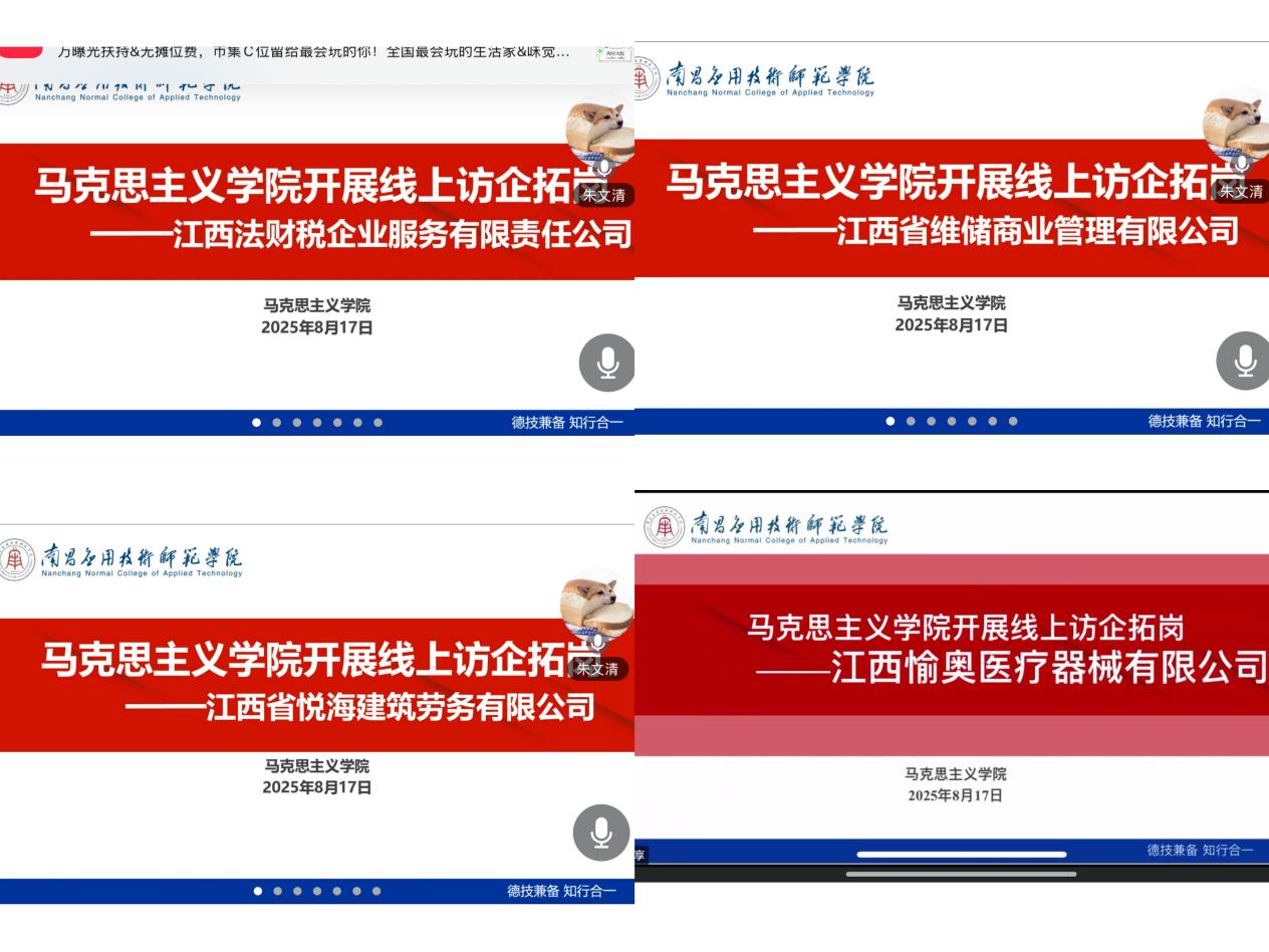 2025年8月17日上午,beat365与江西法财税企业服务有限责任公司、江西省维储商业管理有限公司、江西省悦海建筑劳务有限公司、江西愉奥医疗器械有限公司开展校企合作,洽谈会在腾讯会议举行。beat365党总支书记张欣康,企业领导参加会议,会议由朱文清主持。