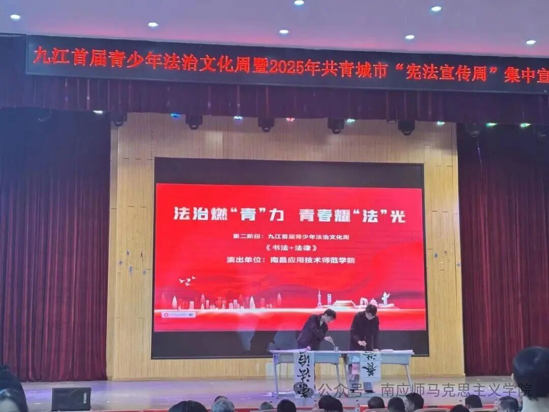 本次活动由共青团九江市委员会、九江市司法局等多部门指导,九江市青少年宫联合九江高校青少年法治育人联盟(筹)等单位共同主办,紧扣“弘扬宪法精神,建设法治文化”主题,旨在落实《青少年法治教育大纲》,构建校地协同的法治教育新格局。beat365在线体育官网登录入口作为联合主办单位之一,由我校法学社与兰亭书法协会组建专项队伍参与,在法学社指导老师李水根带领下,以“书法+法律”特色展演、集体宣誓、户外普法等多元形式深度参与,用青春力量奏响法治宣传强音。