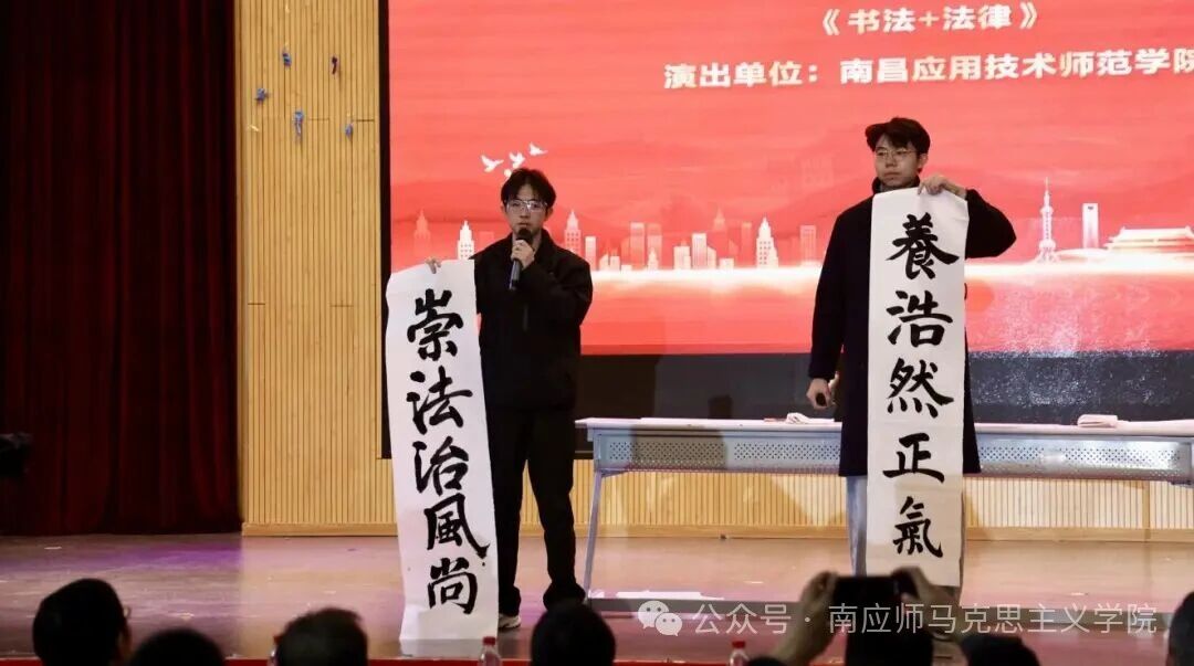 活动现场,我校《书法+法律》特色节目成为全场亮点。兰亭书法协会张望成、钟嘉声同学凝神挥毫,笔锋流转间,《国家安全法》《保密法》的核心宣传标语跃然纸上,尽显传统文化与法治思想的碰撞之美。同时,队伍其他同学向现场嘉宾及师生发放书签、宪法宣传单、宪法典及法治文创礼品,将法律知识转化为鲜活载体,让法治理念在潜移默化中浸润人心,赢得全场阵阵掌声。